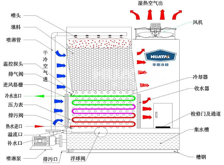 簡介:橫流閉式冷卻塔特點結(jié)構(gòu)外板:使用進(jìn)口鍍鎂鋁鋅外板,防腐效果突出,使用壽命是鍍鋅板的10-20倍,其表面的涂層具有流動性,具備切口保護(自愈合維護:占地面積小,設(shè)有檢修通道,可快速檢修;冷卻器在冷卻塔底部,雙面檢修,橫流閉式冷卻塔方便日常維護噴淋系統(tǒng):噴淋水把冷凝器外壁完全淋濕,形成包裹狀,避免在干點部位形成水垢,將系統(tǒng)效率提高到大程度脫水器:高效的脫水器,具有可改變風(fēng)向三次以上的通道結(jié)構(gòu),漂水率低填料:PVCdm料一一臺塑原生料,真空吸塑一次成型、漂水率低。具有非常強的抗寒凍性能,優(yōu)良的親水性,熱力性能和